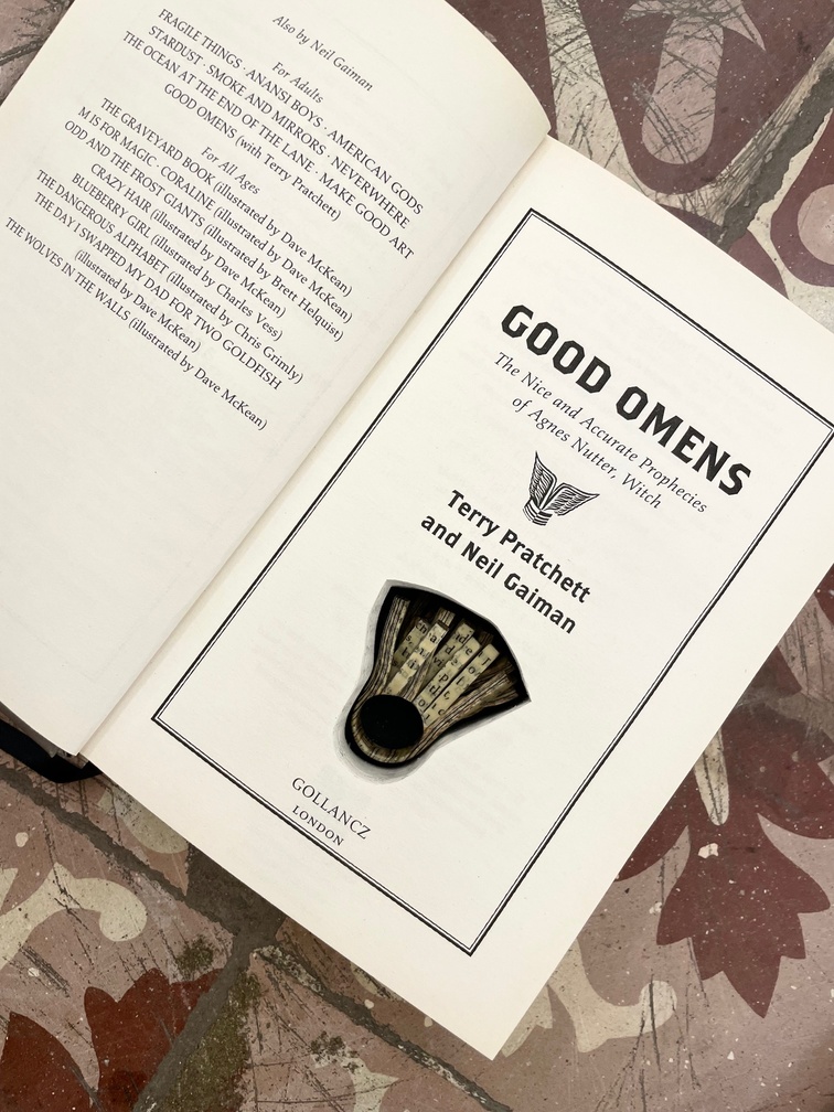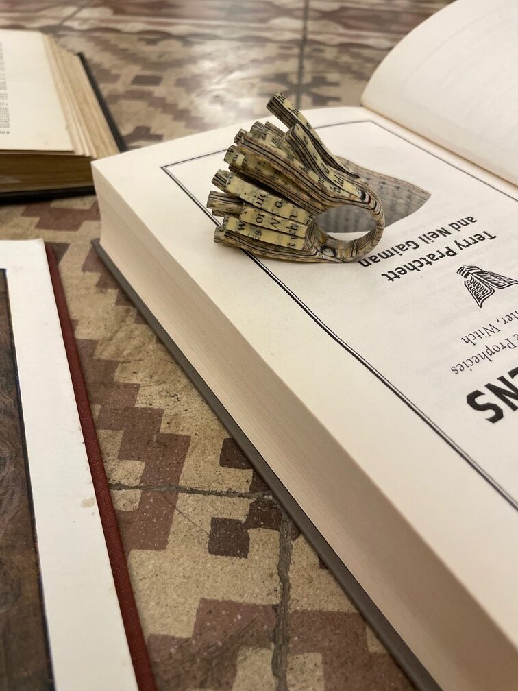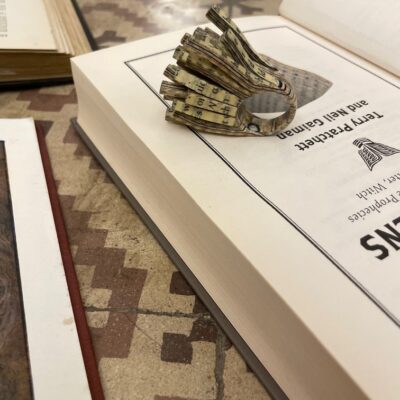 Unique art ring made out of the pages of the book “Good Omens” by Terry Pratchett and Neil Gaiman. A unique piece made of paper with dimensions : 4,5cm x 4cm. Ring Size : 57 1/2. Each jewelry piece is accompanied by the book it was made from.