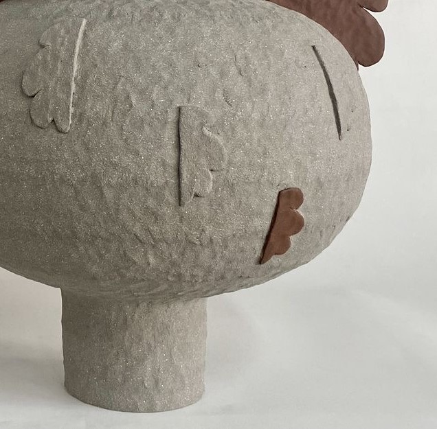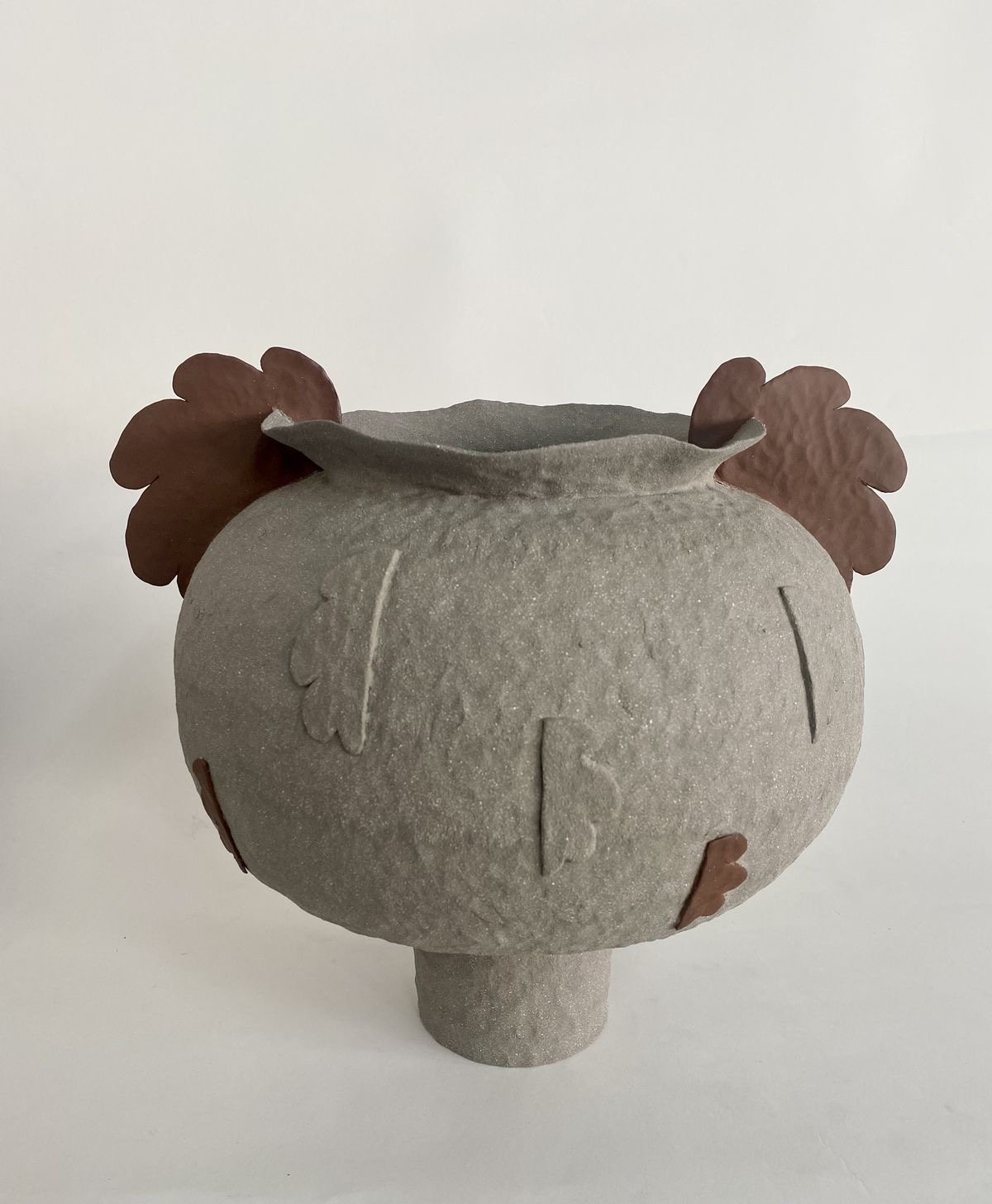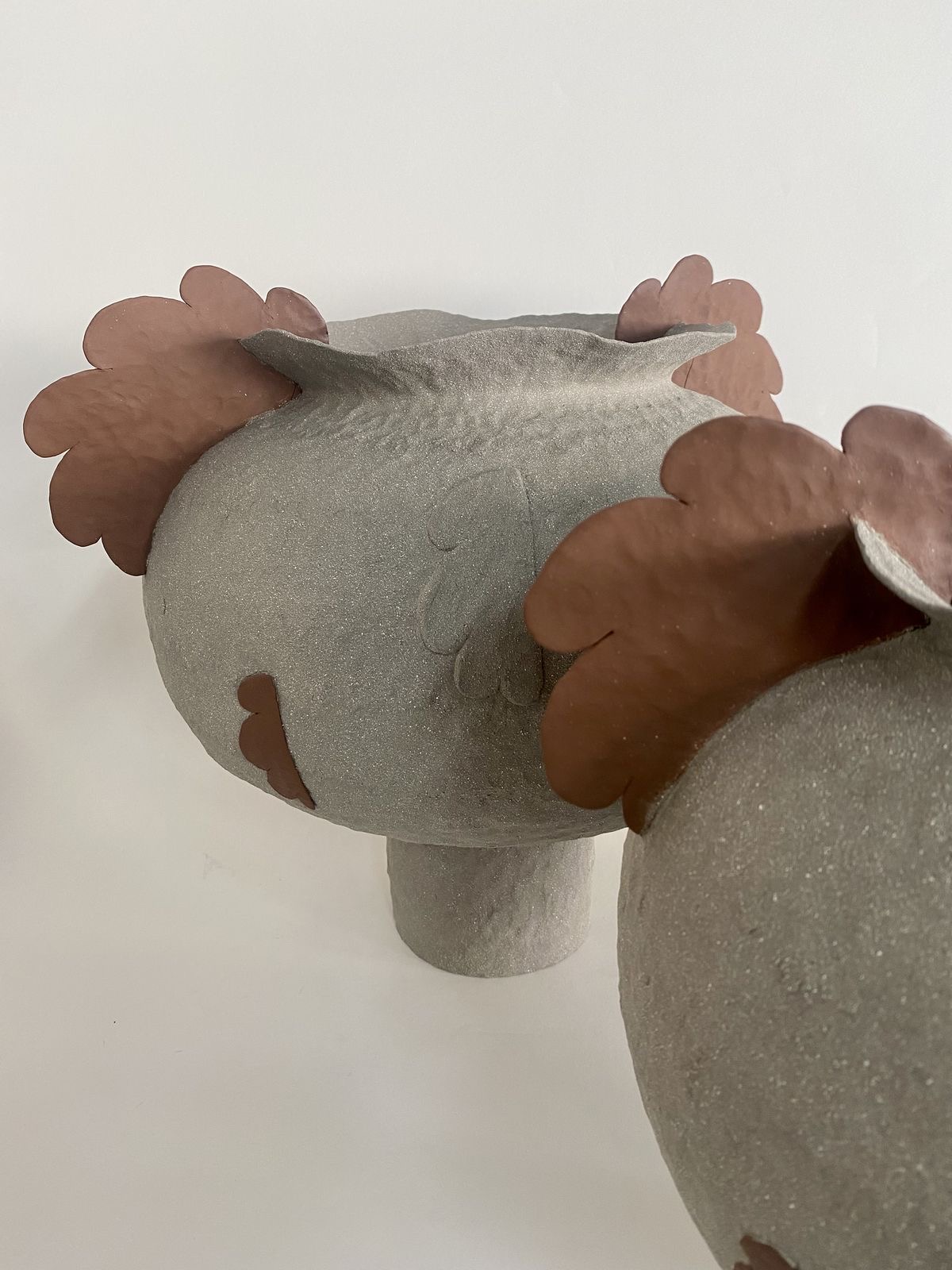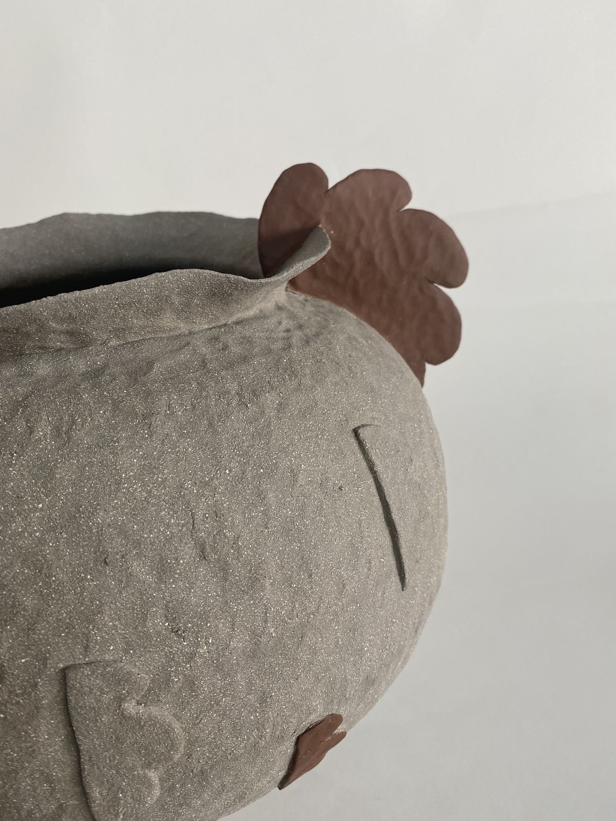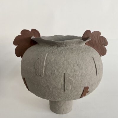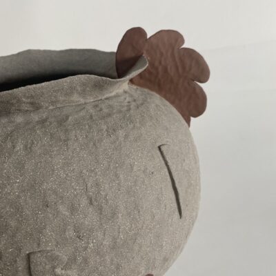 Organic forms, curves with earthy tones decorated with handmade realistic ceramic flowers, made with the coil technique, one of the oldest ancienmt ceramic techniques.