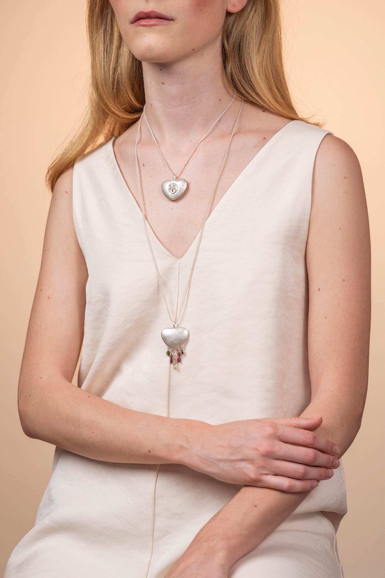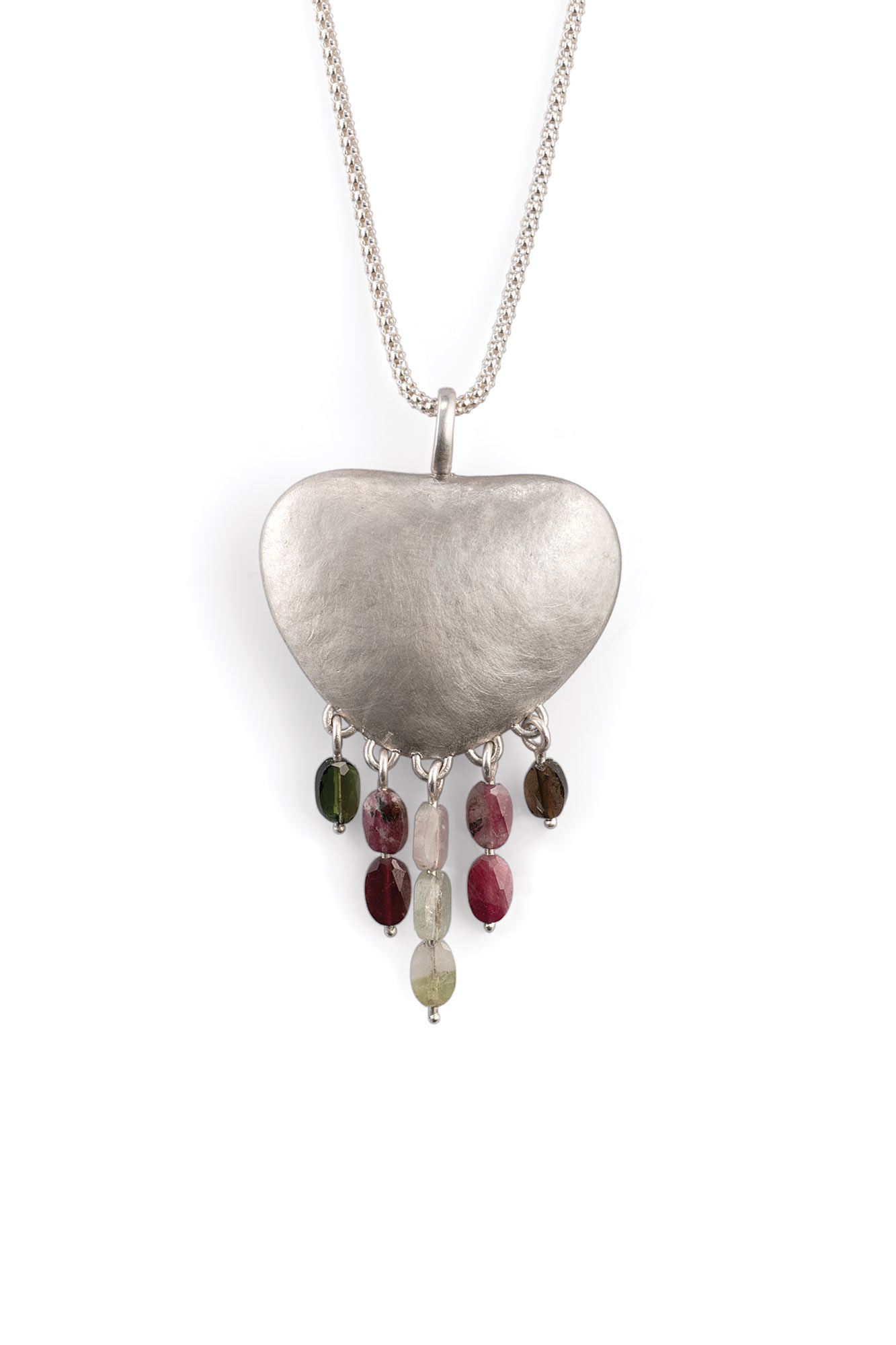 Silver 925, hammered heart pendant with tourmalines at a silver chain of 70cm length. By Margarita Malliri.