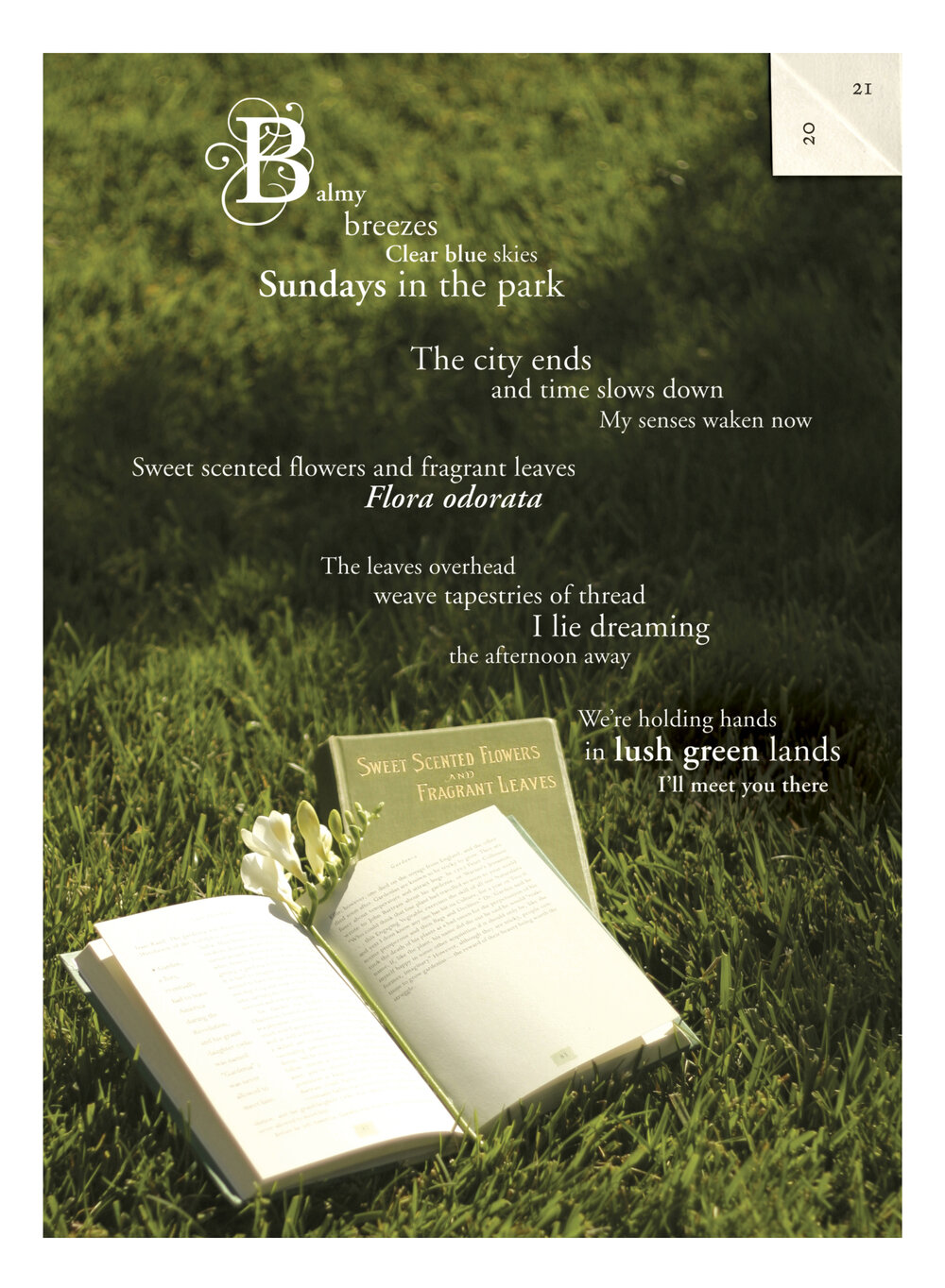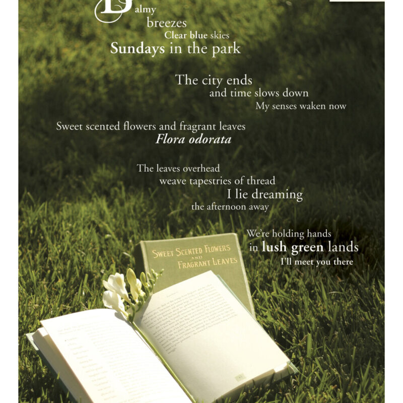 Balmy Days & Sundays is a perfume about perfect moments on a relaxing Sunday, lying in the grass, breathing the smells of sweet-scented flowers and fragrant leaves. Let your senses be awakened by this elixir of fresh botanical scents. Green notes of foliage and grass are entwined with the sweet scent of yellow freesia, honeysuckle, and rose. Forecast: Balmy weather and whispering soft-scented breezes.
