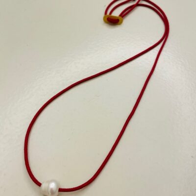 Bracelet from dark Red Cord and sterling Silver Closure with a Fresh Water Pearl. Dimensions: length 75cm. You wrap it twice or thrice around your wrist. You can also wear it as a long pendant. Adjustable closure. By Anna Rosa Moschouti