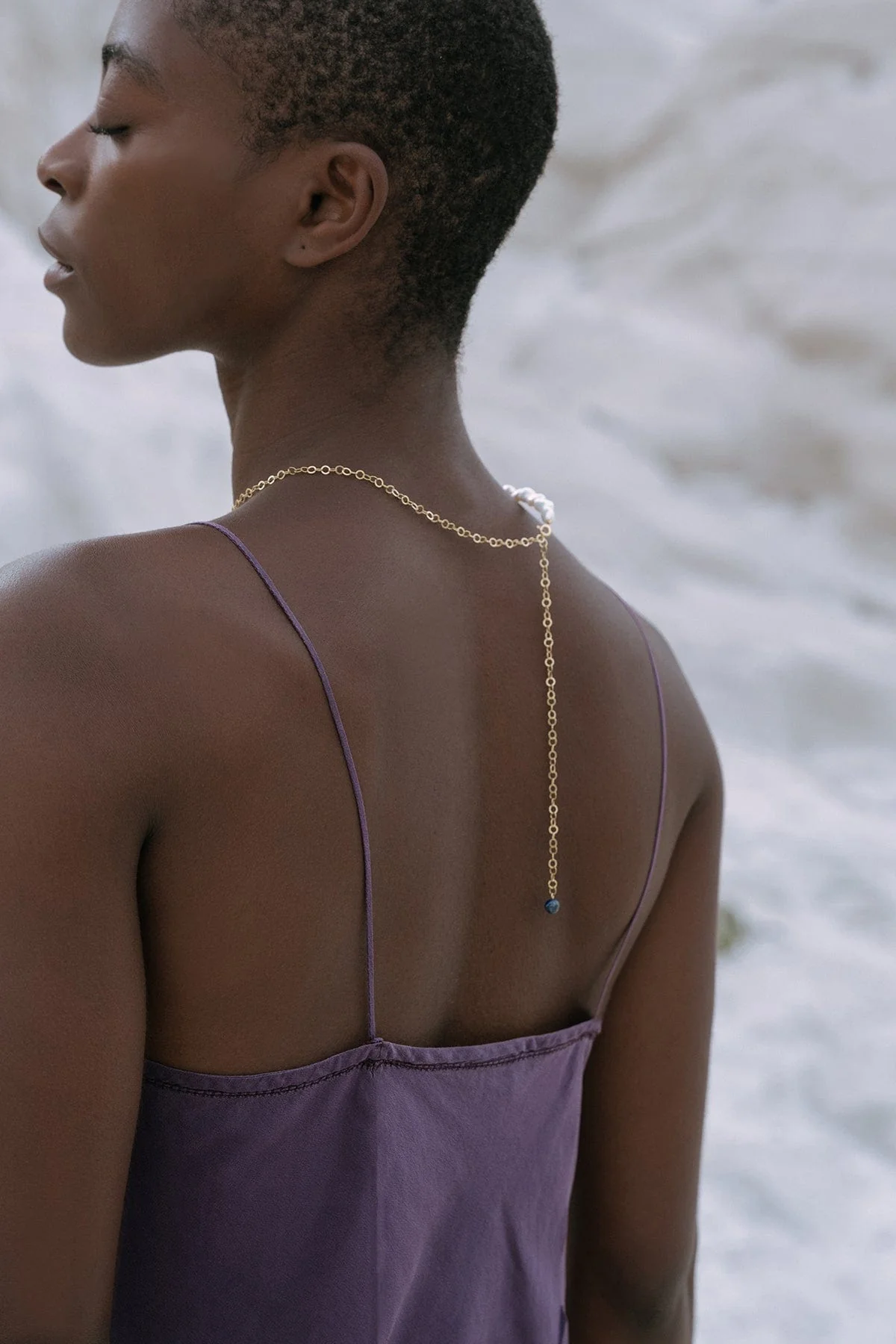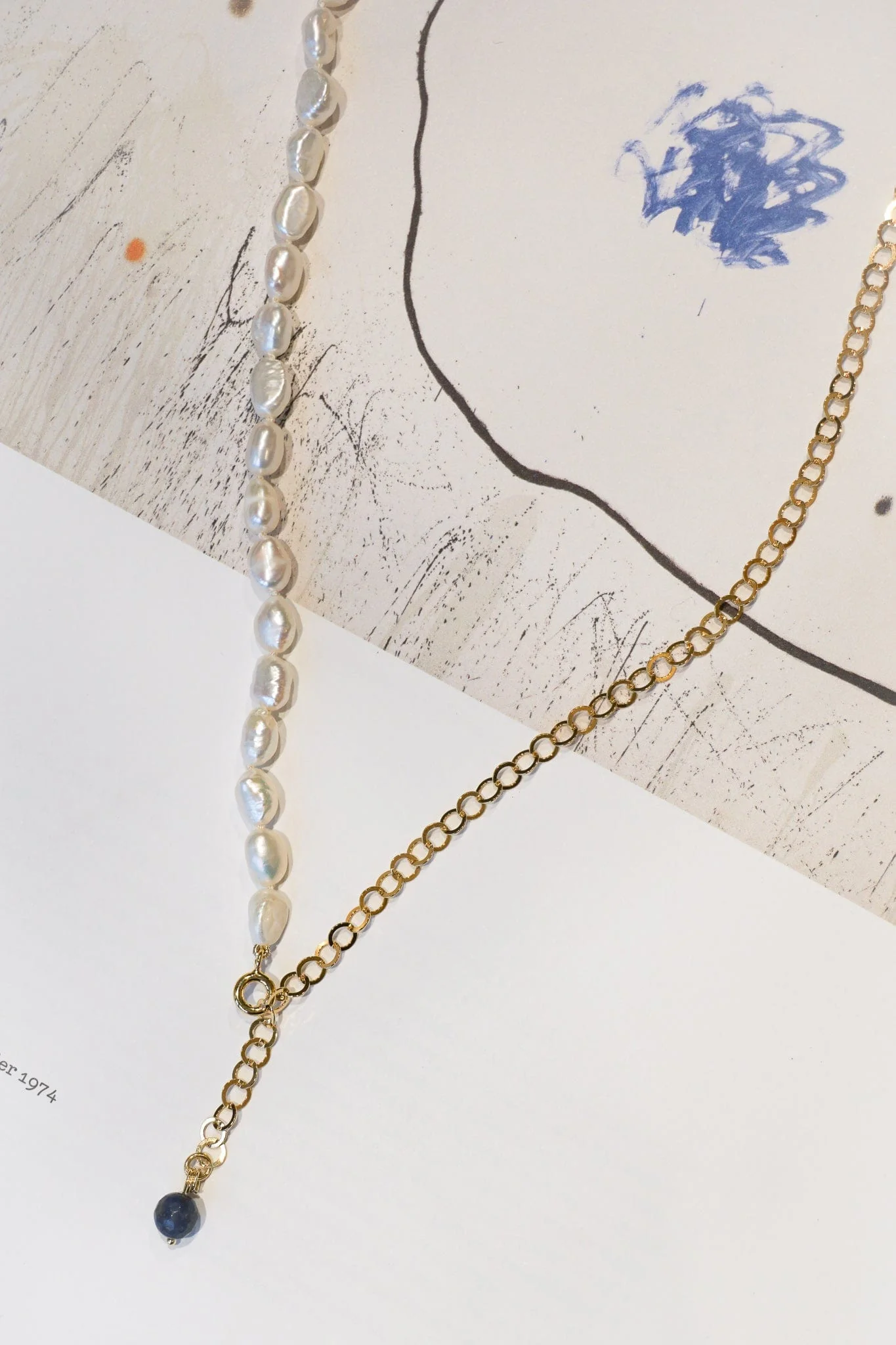 Goldplated Chain necklace with freshwater pearls and a lapis lazuli stone at its end. Total Length : 48cm but its is adjustable to different lengths.