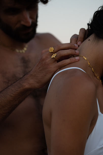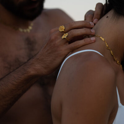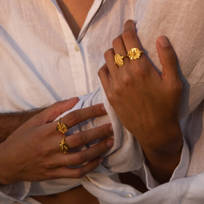 “Shales” is a hybrid capsule collection, inspired by the summertime spent in the Cyclades. The wild olive branch used to make the “kotinos”/wreath of the most honorable distinction offered to athletes in the Olympic Games. For this rewarding tribute of respect, the olive branches came from the trees outside of Zeus’s temple, cut only with a golden pair of scissors. Hand-sculpted in detail, meant to imitate the remnant fossils imprinted on shales, still surviving in time.