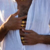 “Shales” is a hybrid capsule collection, inspired by the summertime spent in the Cyclades. the scarab – especially the green kind – is known for signaling longevity and rebirth, coming all the way from the Middle East to affect the Greeks in the most peculiar ways, like centrifugal observations. It was also worshiped as a live jewel, since used from gem engravers as a study of forms. Stones were also sculpted in the shape of scarabs to be gifted to pregnant women in order to keep them safe. Hand-sculpted in detail, meant to imitate the remnant fossils imprinted on shales, still surviving in time.