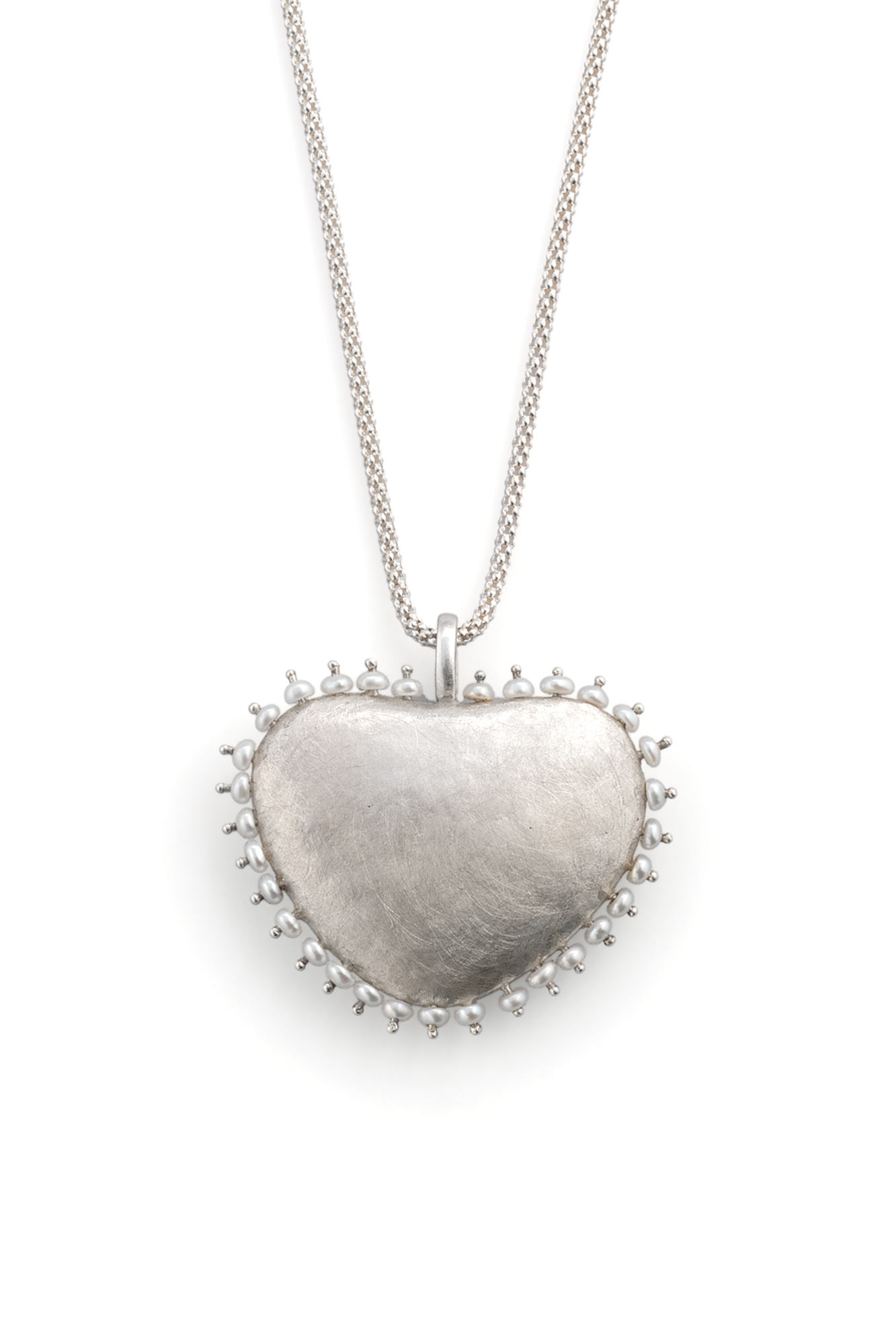 Silver 925, hammered heart pendant (TAMA) with baby, freshwater pearls at a silver chain of  70cm length. By Margarita Malliri.