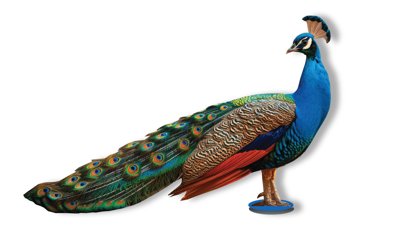 Peacock figure made of printed aluminium on a round base, dimensions: 39 x 24 cm, base perimeter :5cm