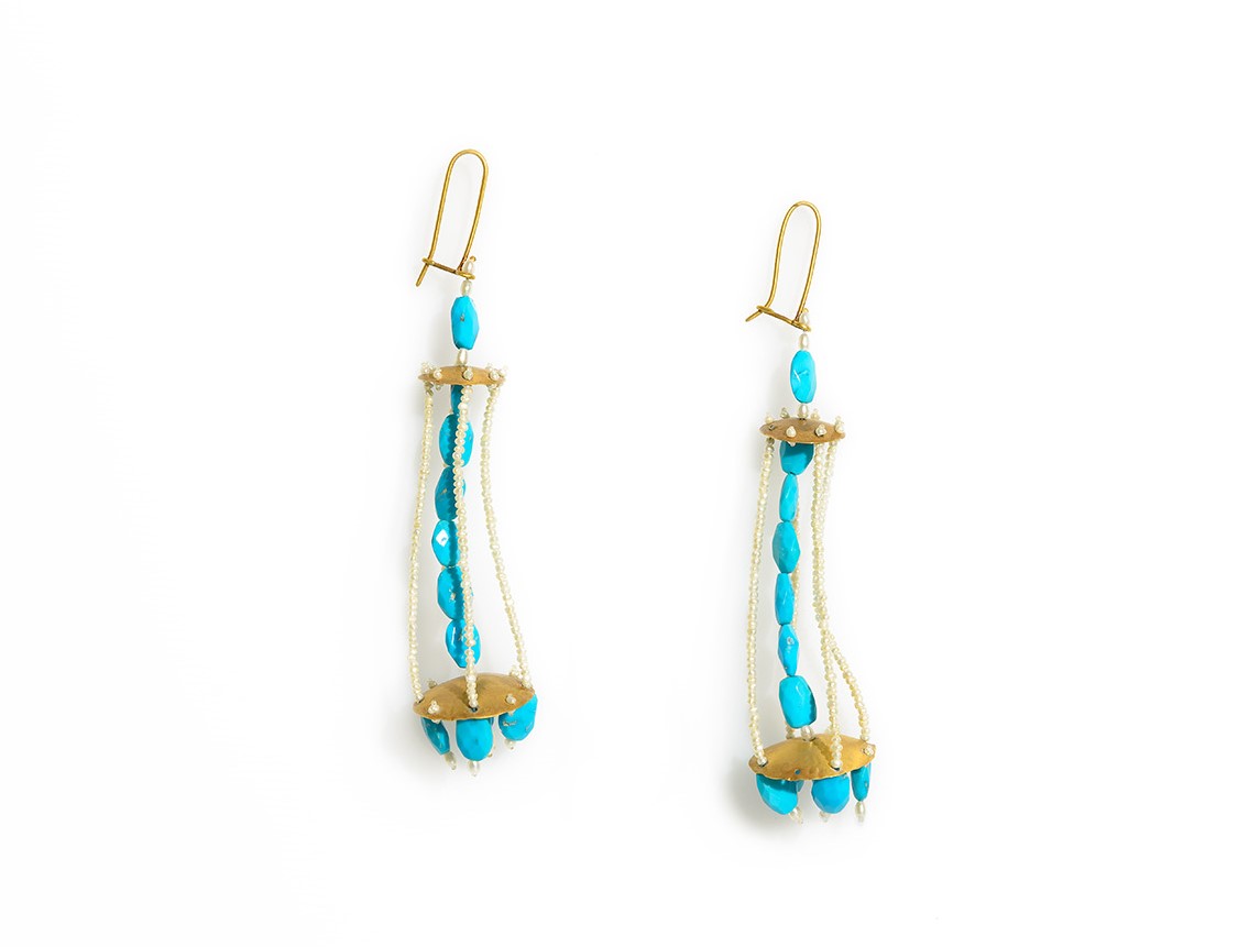 Gold 18k earrings with turquoise stones and baby pearls. Unique piece. Length : 10cm