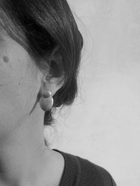 Pebbles are elements that exist on the limits between land and water where they undergo a continuous transformation. Through the application of hammering techniques, this collection seeks to explore the volume and the shape of the forms. All pieces are hollow, creating like this a game through movement, sound and the illusion of weight. Thetis Silver earrings consist of two parts. The upper pebble that is actually a stud earring and the bottom one that can be added or removed, creating like that two different pairs and two different ways to wear them.