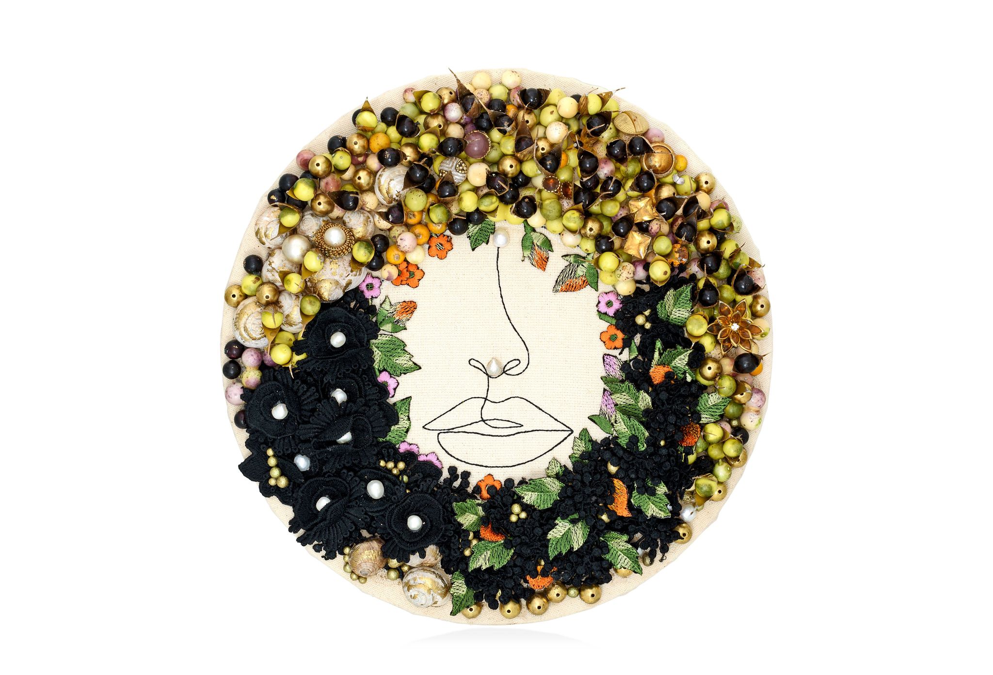 Collage/Assemblage artwork. Early 20th century Embroidery, Machine Embroidery, Digital Embroidery, Textile, Thread, Fruits, Freshwater Pearls, Mineral Stones, Plastic Elements, Objet Trouvé, Snails, Pigment. Canvas Diameter 30cm
