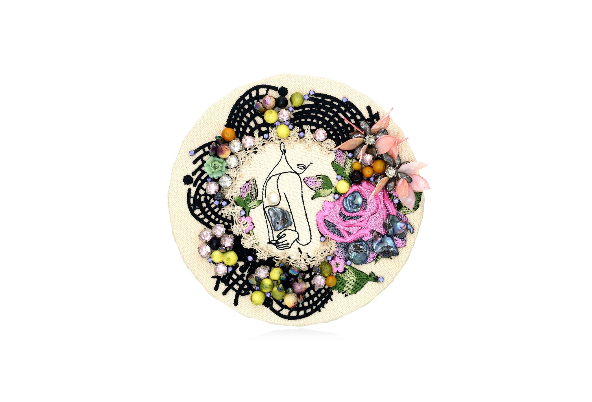 Collage/Assemblage artwork. Early 20th century Embroidery, Machine Embroidery, Digital Embroidery, Textile, Thread, Fruits, Freshwater Pearls, Mineral Stones, Plastic Elements, Objet Trouvé, Snails, Pigment. Canvas Diameter 20cm